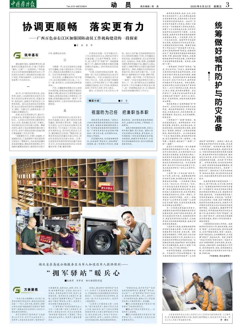 另一方面要注重挖掘自身潛力。應(yīng)根據(jù)所在城市資源稟賦和防護(hù)防災(zāi)準(zhǔn)備的需要,按照平戰(zhàn)結(jié)合的要求,研究引進(jìn)兼具時(shí)代特點(diǎn)、地域特征的項(xiàng)目,探索具體管用的方法路子,以此把軍地雙方的積極性調(diào)動(dòng)起來(lái),把各方面的資源統(tǒng)籌起來(lái)。