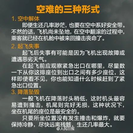 據(jù)中國國家應(yīng)急廣播網(wǎng)發(fā)布的《飛機(jī)逃生事故法則》顯示,飛機(jī)失事常見的有三種形式。