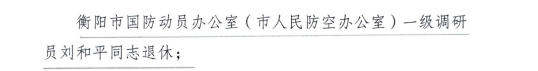 根據(jù)衡委干[2024]103號文件,衡陽市國防動員辦公室(衡陽市人民防空辦公室)一級調(diào)研員劉和平同志退休。