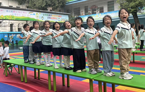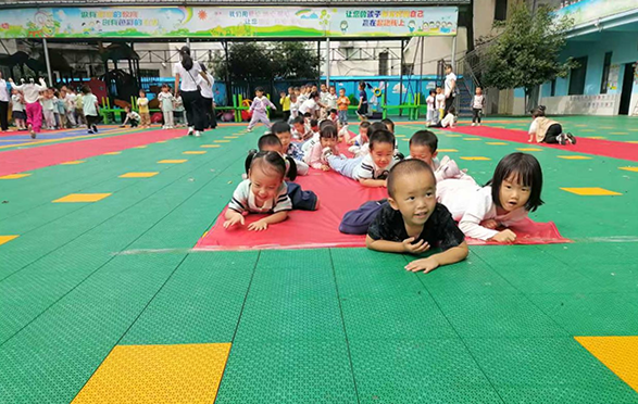 "憶征程"主題游戲?qū)⒒顒油葡蚋叱?。小班孩子?quot;匍匐前進(jìn)"墊子時(shí),小胳膊撐得發(fā)紅卻咬牙往前挪,復(fù)刻著長征的堅(jiān)韌;中班孩子玩"摸爬滾打",順著滑溜布像小團(tuán)子般翻滾;大一班孩子張開胳膊,跳躍挑戰(zhàn)"展翅橫空",模擬跨越障礙的勇敢;大二班孩子"翻山越嶺"跨課桌時(shí),還會主動伸手拉起同伴,學(xué)著長征戰(zhàn)士互幫互助的模樣。"勝利會師"時(shí)刻,孩子們跨過最后一道障礙時(shí),5歲的曾樂潼蹦著歡呼:"我們像小紅軍一樣勝利啦!"