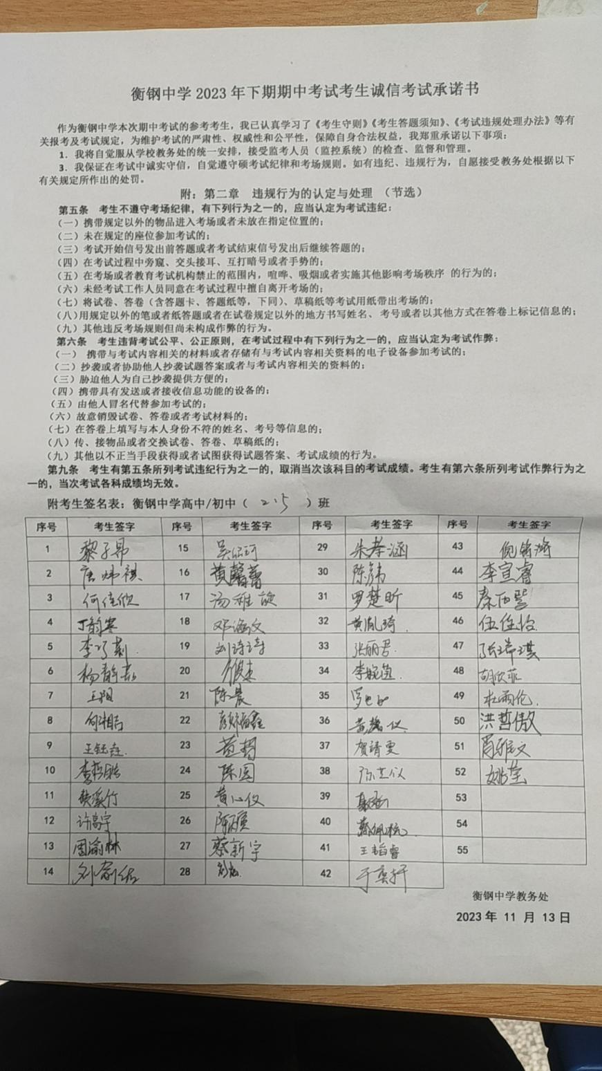 通過組織學生簽訂《衡鋼中學2023年下期期中考試考生誠信考試承諾書》,幫助學生樹立誠信意識,增強誠信觀念,塑造誠信品質(zhì)。要求學生講誠信,從小事做起,從我做起,端正考試心態(tài),嚴格遵守考試紀律。