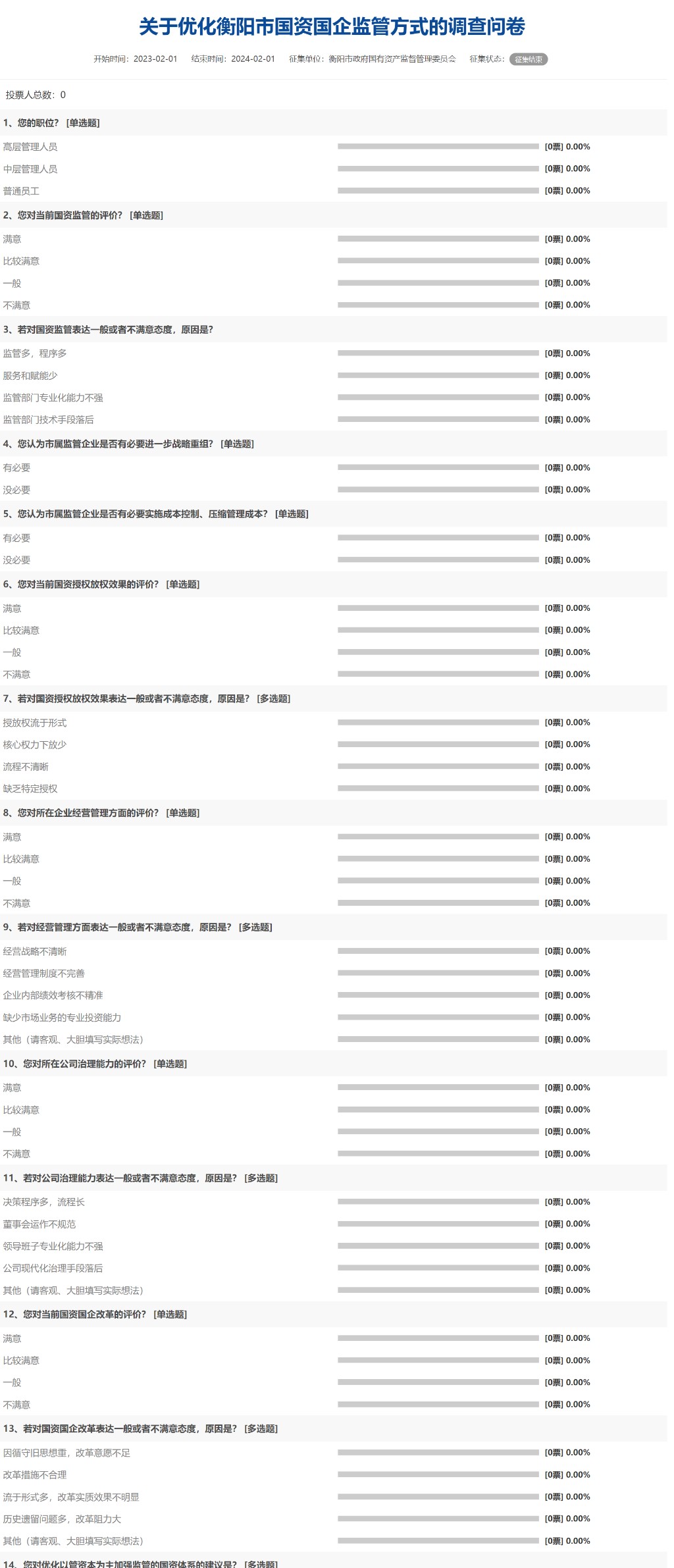 關(guān)于優(yōu)化衡陽市國資國企監(jiān)管方式的調(diào)查問卷自2023年02月01日開始,至2024年02月01日結(jié)束,投票人數(shù)為0,具體參與人數(shù)如下: