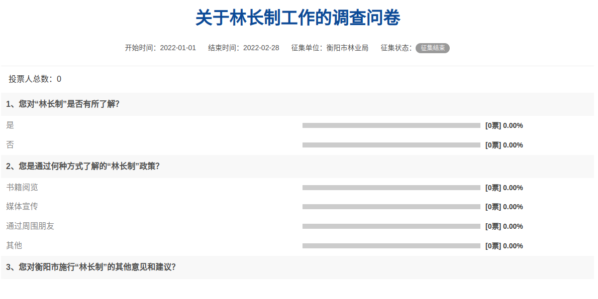 關(guān)于林長制工作的調(diào)查問卷開始于2022年01月01日,結(jié)束于2022年02月28日,參與調(diào)查人數(shù)0人,調(diào)查結(jié)果如下: