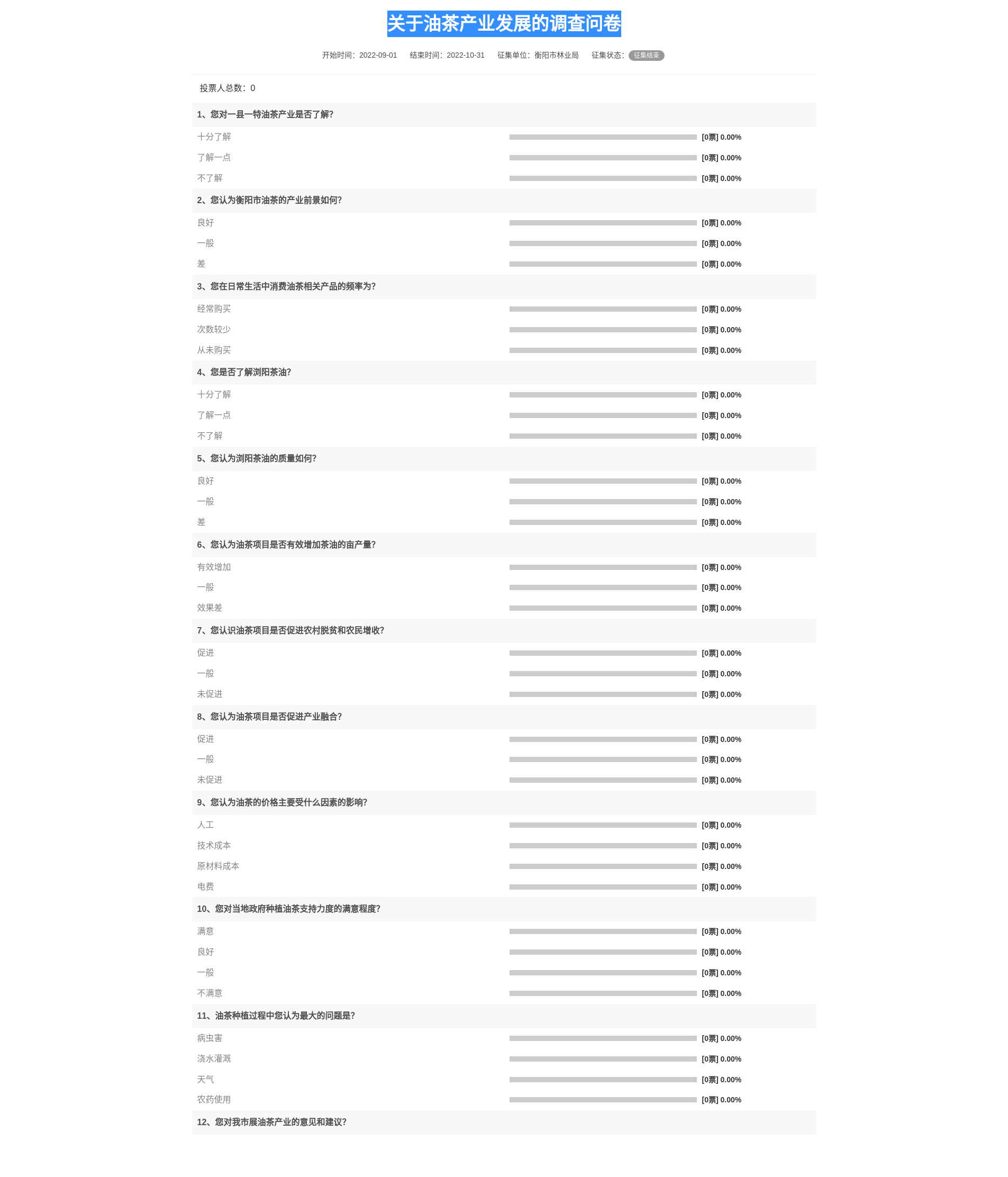 關于油茶產業(yè)發(fā)展的調查問卷開始于2022年09月01日,結束于2022年10月31日,參與調查人數(shù)0人,調查結果如下:
