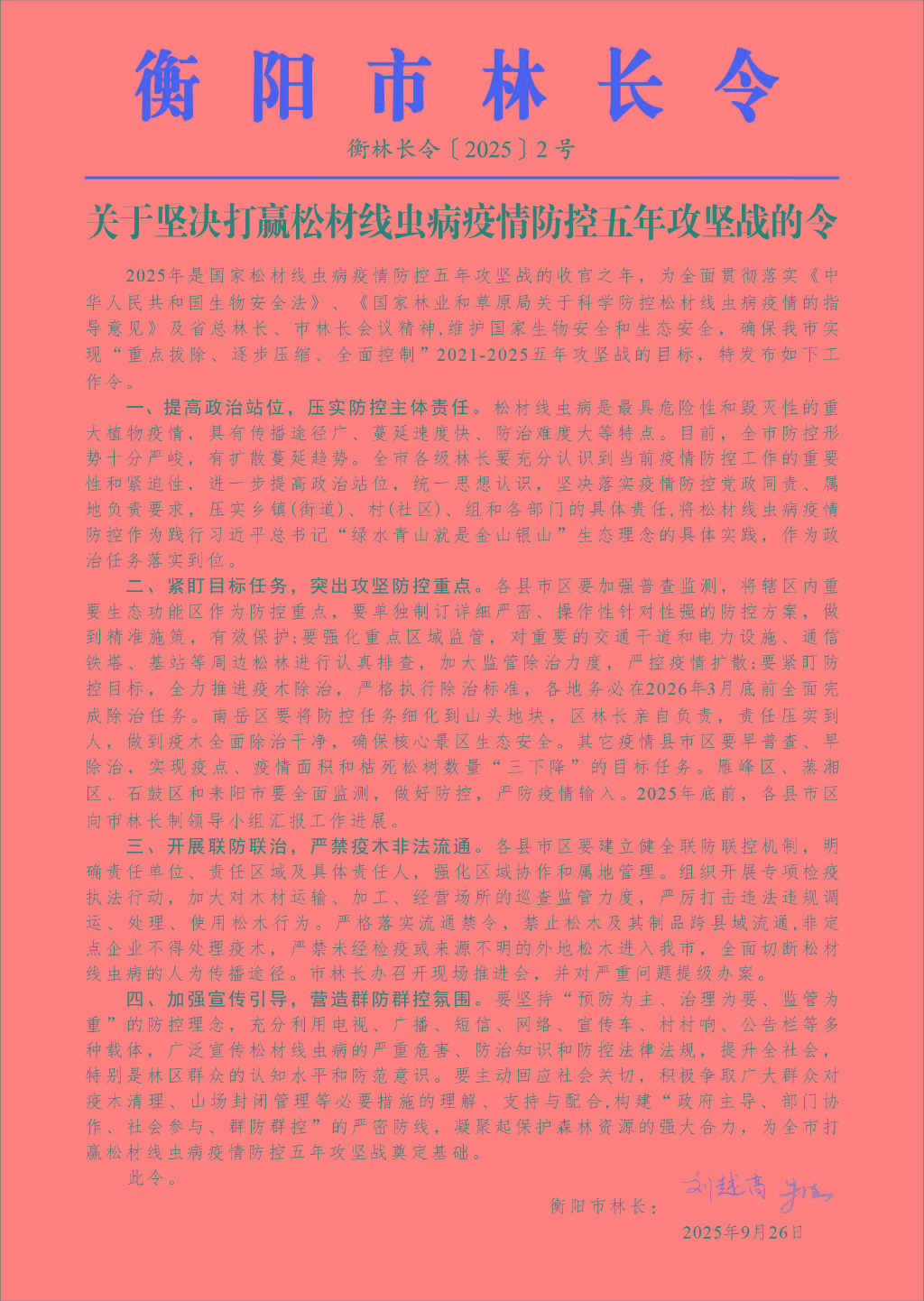 近日,市委書記、市林長劉越高,市委副書記、市長、市林長朱健共同簽發(fā)衡陽市2025年第1號林長令,對全面推進(jìn)深化集體林權(quán)制度改革工作進(jìn)行安排部署。