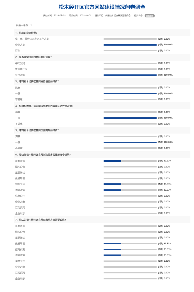 松木經(jīng)開區(qū)官方網(wǎng)站建設情況問卷調(diào)查自2025年3月5日開始,至2025年4月5日結(jié)束,投票人數(shù)1人,具體情況見下圖統(tǒng)計: