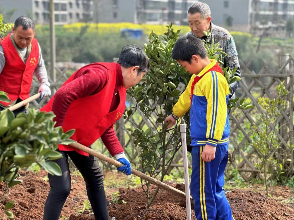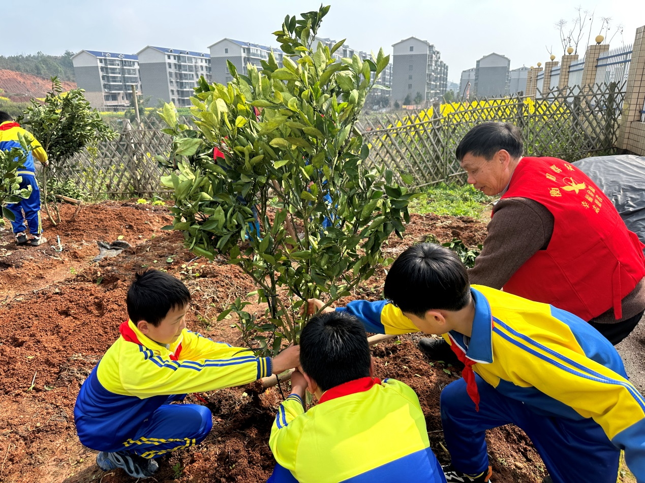 即使前夜春雨過后,現(xiàn)場一片泥濘,志愿者和同學們也絲毫不在意。大家分工合作,志愿者揮舞著鋤頭,挖出一個個大坑,等待著小樹苗“入住”;同學們有的幫忙扶樹、有的覆土、有的澆水……大家齊心協(xié)力、熱情高漲,每個人都鉚足了干勁,忙得不亦樂乎。不一會兒,七月琵琶、砂糖柚、砂糖柑等小樹苗便 “亭亭玉立”在沃土之上。
