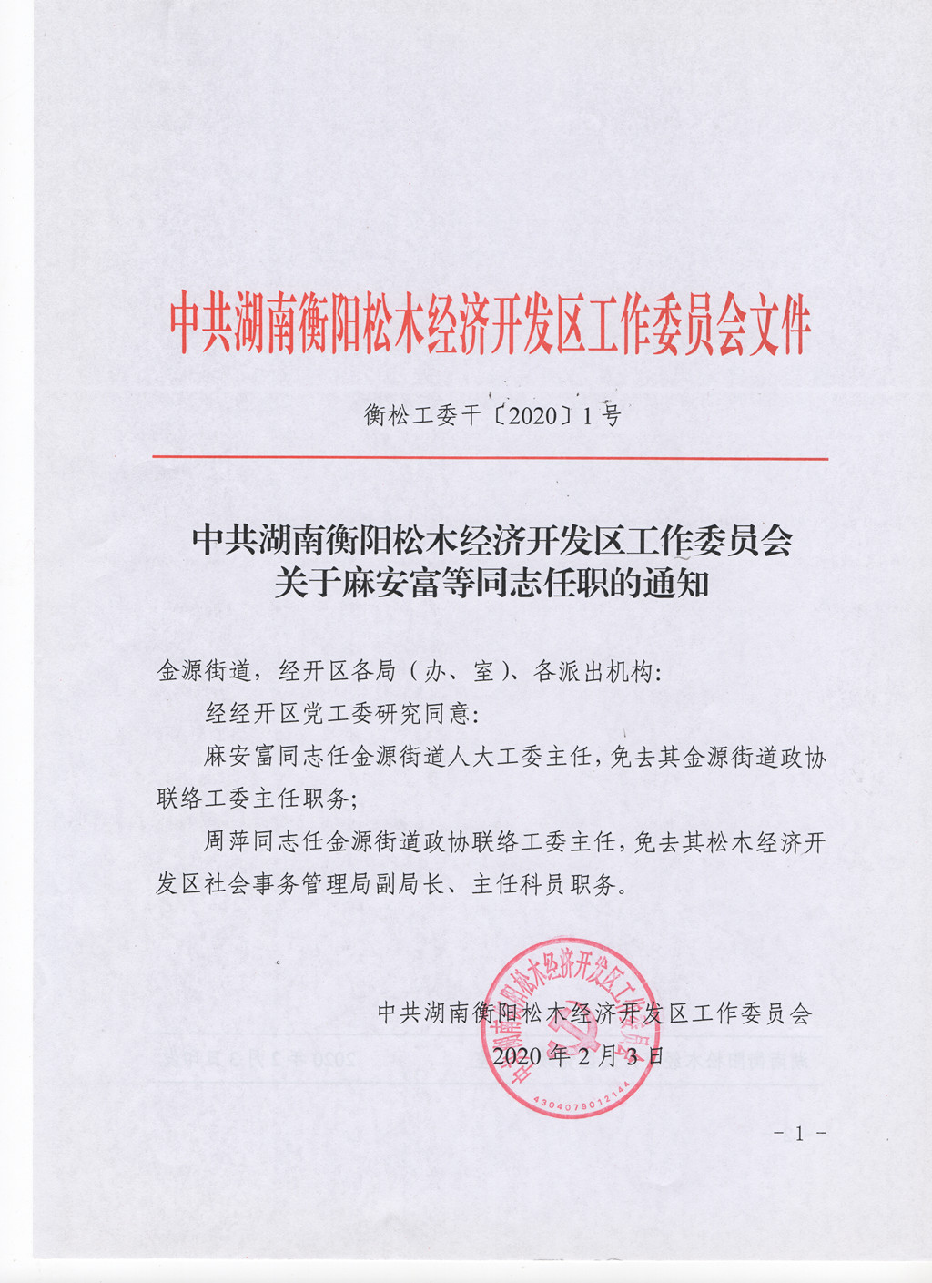 中共湖南衡陽松木經(jīng)濟(jì)開發(fā)區(qū)工作委員會關(guān)于麻安富等同志任職的通知