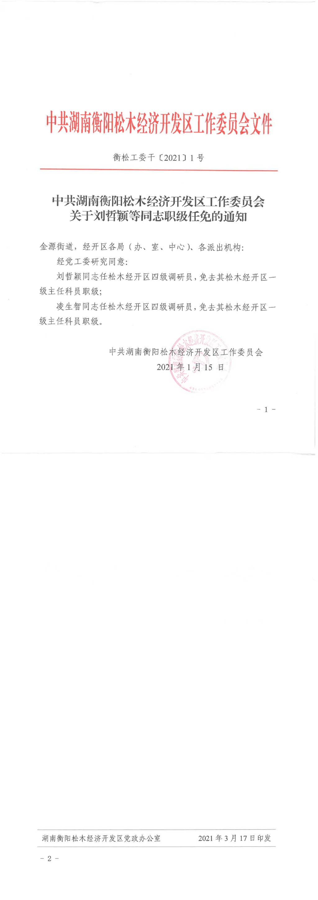 中共湖南衡陽松木經(jīng)濟(jì)開發(fā)區(qū)工作委員會關(guān)于劉哲穎等同志職級任免的通知