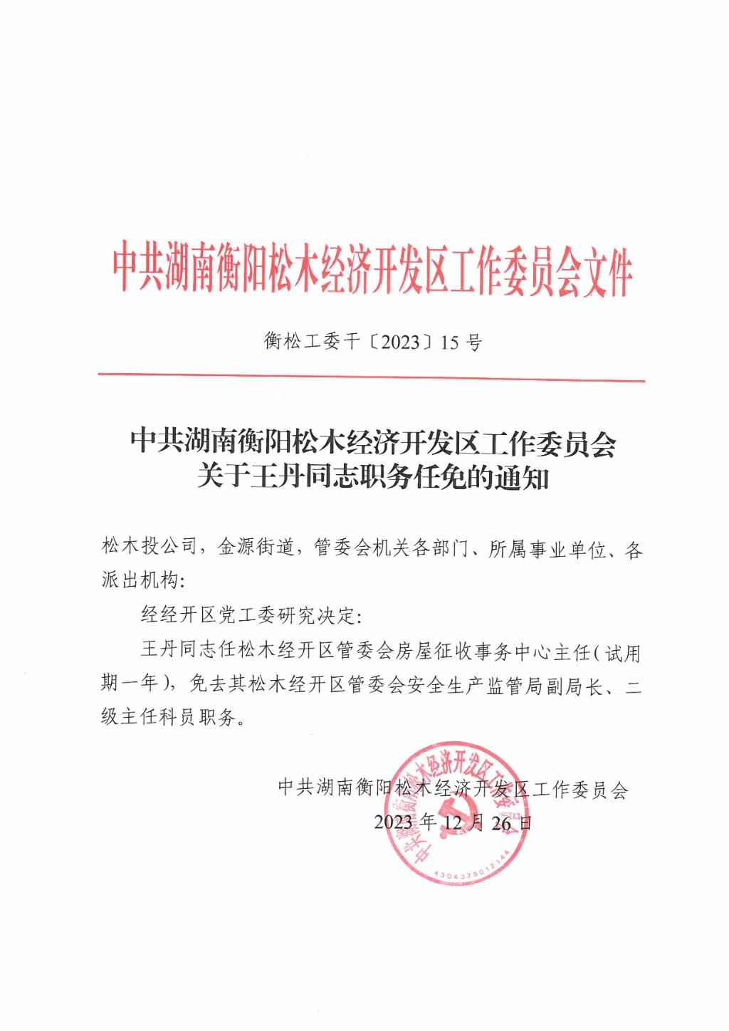 中共湖南衡陽松木經濟開發(fā)區(qū)工作委員會關于王丹同志職務任免的通知