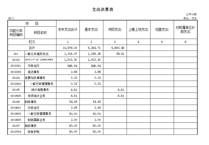 本年支出合計10978.2萬元,其中:基本支出5294.71萬元,占 48.23 %;項目支出 5683.49萬元,占51.77%