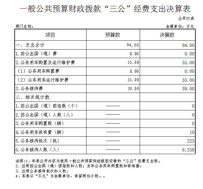 (十二)“三公”經(jīng)費:是指財政撥款安排的因公出國(境)費、公務用車購置及運行費和公務接待費。其中,因公出國(境)費反映單位公務出國(境)的住宿費、旅費、伙食補助費、雜費、培訓費等支出;公務用車購置及運行費反映單位公務用車購置支出及租用費、燃料費、維修費、過路過橋費、保險費、安全獎勵費用等支出;公務接待費反映單位按規(guī)定開支的各類公務接待(含外賓接待)支出。