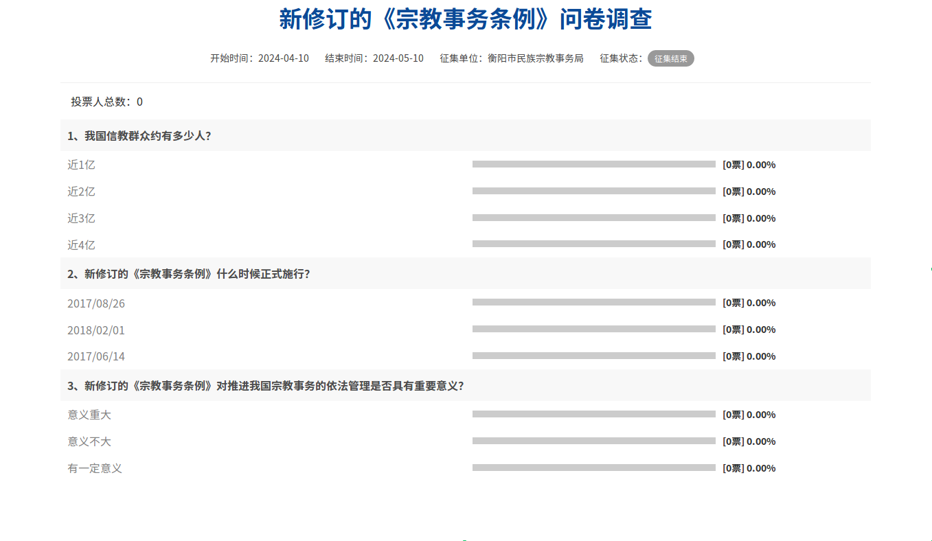 新修訂的《宗教事務(wù)條例》問卷調(diào)查自2024年4月10日開始,至2024年5月10日結(jié)束,投票人數(shù)0人,具體情況見下圖統(tǒng)計: