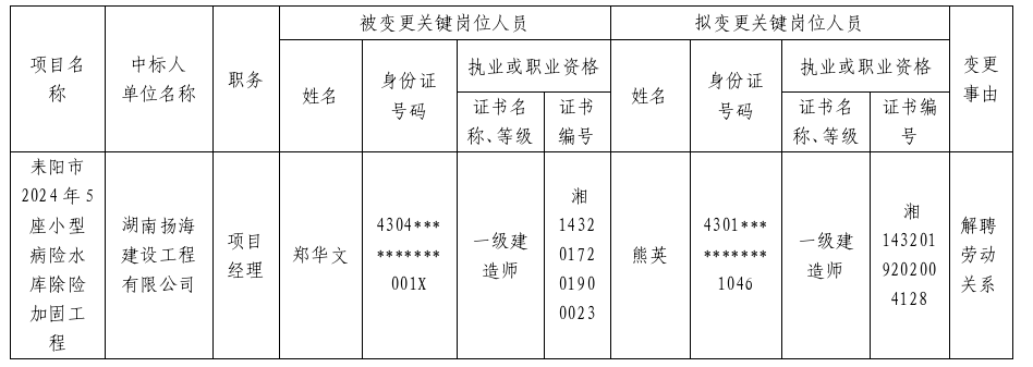 參照《關(guān)于加強(qiáng)增發(fā)國債資金水利項(xiàng)目施工現(xiàn)場(chǎng)關(guān)鍵崗位人員管理有關(guān)事項(xiàng)的通知》(衡水利〔2024〕65號(hào))的有關(guān)規(guī)定,現(xiàn)將耒陽市2024年5座小型病險(xiǎn)水庫除險(xiǎn)加固工程施工單位的項(xiàng)目經(jīng)理變更情況予以公示。公示期間,如有問題,請(qǐng)向我單位反映。