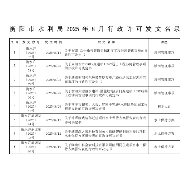 衡陽市水利局2025年8月行政許可發(fā)文名錄