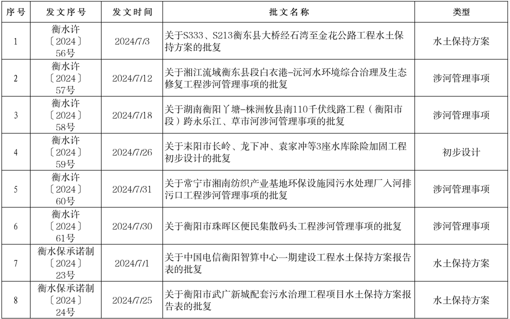 衡陽市水利局2024年7月行政許可發(fā)文名錄