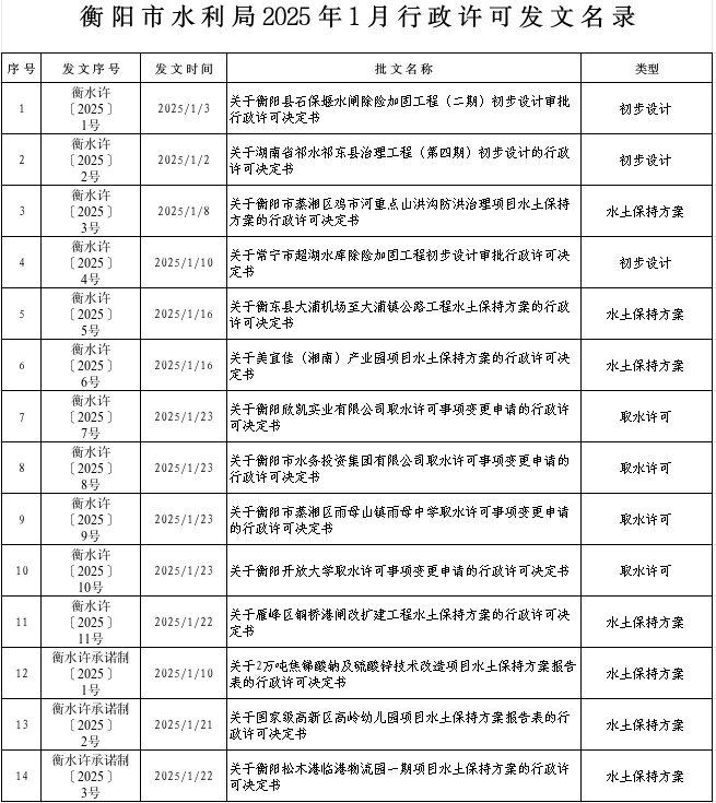 衡陽市水利局2025年1月行政許可發(fā)文名錄