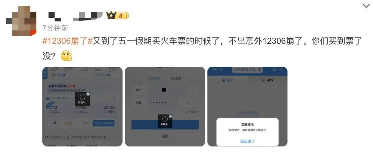 不少網(wǎng)友在社交媒體上表示,今天打算購買4月30日的車票,卻發(fā)現(xiàn)12306出現(xiàn)無法正常登錄、購票卡頓、訂單顯示異常等問題。