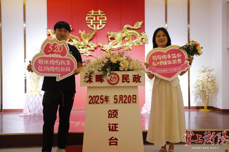 “5·20”當(dāng)天,各縣(市)區(qū)婚登機(jī)關(guān)創(chuàng)新舉辦一系列別出心裁的主題活動(dòng)。繼去年“5·20”舉辦集體婚禮后,今年祁東縣又為19對(duì)新人在蔣家橋鎮(zhèn)龍興村舉行了簡(jiǎn)約喜慶的中式集體婚禮,新人現(xiàn)場(chǎng)簽署婚事簡(jiǎn)辦、喜事新辦倡議書,引領(lǐng)節(jié)儉、文明的婚嫁風(fēng)尚,完成了新婚禮、新婚俗“文明接力”。石鼓區(qū)舉辦了一場(chǎng)以“傳承好家風(fēng)、新辦婚喜事”為主題的戶外集體頒證儀式,邀請(qǐng)道德模范——參戰(zhàn)老兵金婚夫妻分享經(jīng)營(yíng)幸福家庭的經(jīng)驗(yàn),還邀請(qǐng)婚事簡(jiǎn)辦新人代表分享婚事簡(jiǎn)辦心得。衡東縣在婚登現(xiàn)場(chǎng)設(shè)置了主題打卡墻、發(fā)放了家庭教育手冊(cè)、為異地新人打造家庭驛站等。衡南縣設(shè)置了新婚俗簽名墻,為新人發(fā)放紀(jì)念品。耒陽(yáng)市、衡陽(yáng)縣、衡山縣、南岳區(qū)等地為新人組織家庭教育主題講座,倡導(dǎo)廣大新婚夫婦樹立良好的新時(shí)代婚育觀等,提升了婚姻登記服務(wù)的溫度,豐富了工作內(nèi)涵。