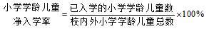 小學(xué)學(xué)齡兒童凈入學(xué)率 指調(diào)查范圍內(nèi)已入小學(xué)學(xué)習(xí)的學(xué)齡兒童占校內(nèi)外學(xué)齡兒童總數(shù)的比重。計(jì)算公式為: