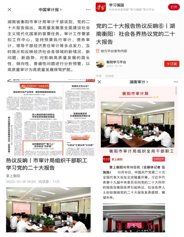 加強宣傳力度。第一時間報道審計機關(guān)干部深入學(xué)習(xí)貫徹黨的二十大精神的具體行動和生動實踐,撰寫的經(jīng)驗做法、心得體會在學(xué)習(xí)強國、《中國審計報》、湖南省審計廳門戶網(wǎng)、掌上衡陽、衡陽電視臺等中央、省、市各媒體平臺刊發(fā),傳播審計好聲音、展示審計好形象,形成強大宣傳聲勢。