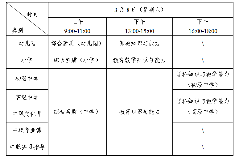 (三)全國(guó)統(tǒng)一考試時(shí)間為3月8日,各類別考試科目與時(shí)間安排如下:?