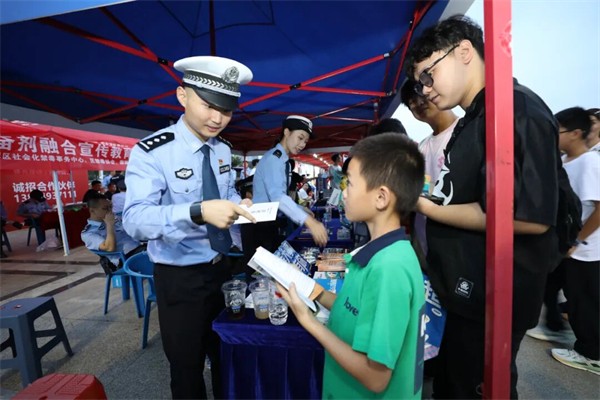 在廣場外的公安服務(wù)點,民輔警們?yōu)槿罕娞峁┵N心服務(wù),幫助群眾尋人尋物、遞上純凈水,并向球迷朋友們現(xiàn)場普及交通安全、禁毒與防電詐知識。