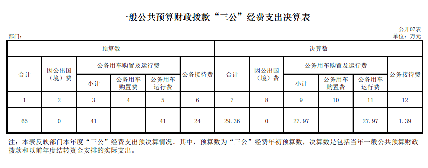 2018年全局公共財政撥款的“三公”經(jīng)費決算支出29.36萬元,“三公”經(jīng)費財政撥款支出預(yù)算65萬元,完成預(yù)算的45.17%。其中:因公出國(境)0萬元,同上年度;公務(wù)接待1.39萬元,比上年減少3.2萬元,減少的原因是公務(wù)接待任務(wù)減少;公務(wù)用車購置及運行維護費27.97萬元,比上年減少9.74萬元(其中車輛購置數(shù)為0萬元),減少的原因是公車改革后車輛減少,并厲行節(jié)約。