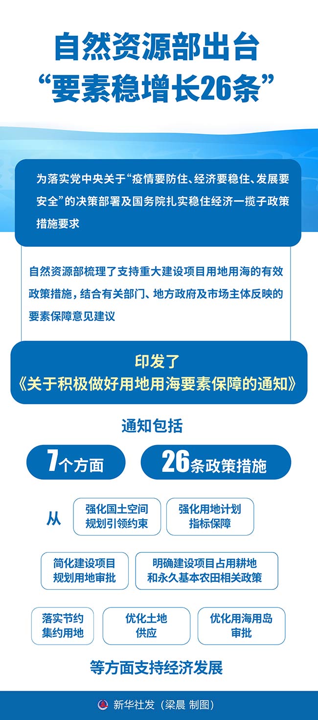 新華社記者8月8日在自然資源部新聞通氣會(huì)上獲悉,為落實(shí)黨中央關(guān)于“疫情要防住、經(jīng)濟(jì)要穩(wěn)住、發(fā)展要安全”的決策部署及國(guó)務(wù)院扎實(shí)穩(wěn)住經(jīng)濟(jì)一攬子政策措施要求,自然資源部梳理了支持重大建設(shè)項(xiàng)目用地用海的有效政策措施,結(jié)合有關(guān)部門、地方政府及市場(chǎng)主體反映的要素保障意見(jiàn)建議,印發(fā)了《關(guān)于積極做好用地用海要素保障的通知》,通知包括7個(gè)方面26條政策措施,從強(qiáng)化國(guó)土空間規(guī)劃引領(lǐng)約束、強(qiáng)化用地計(jì)劃指標(biāo)保障、簡(jiǎn)化建設(shè)項(xiàng)目規(guī)劃用地審批、明確建設(shè)項(xiàng)目占用耕地和永久基本農(nóng)田相關(guān)政策、落實(shí)節(jié)約集約用地、優(yōu)化土地供應(yīng)、優(yōu)化用海用島審批等方面支持經(jīng)濟(jì)發(fā)展。