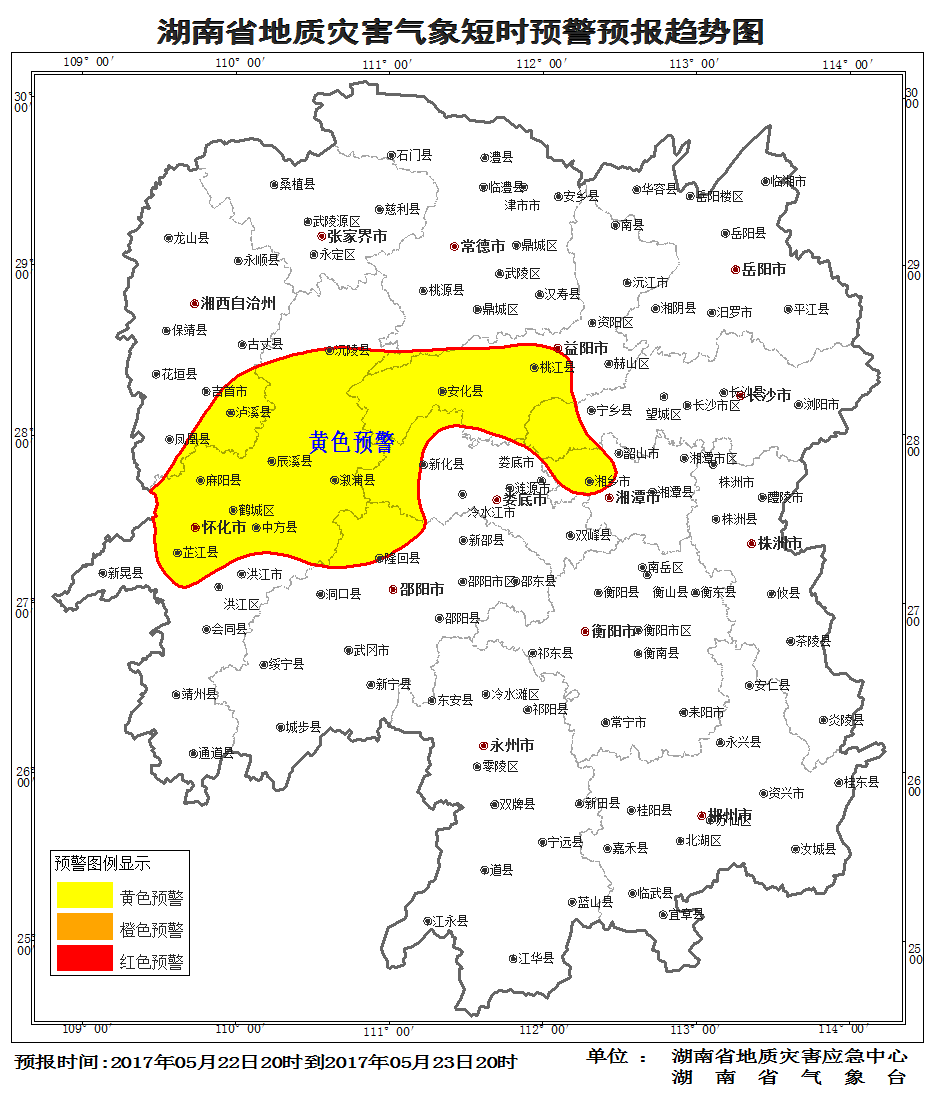 根據(jù)湖南省氣象臺2017年5月22日短期氣象預報情況,湖南省地質(zhì)災(zāi)害應(yīng)急中心與湖南省氣象臺聯(lián)合會商得出如下結(jié)論:自5月22日20:00至23日20:00,受降雨影響,湘西、湘中局地發(fā)生突發(fā)性地質(zhì)災(zāi)害風險較高(黃色預警)。