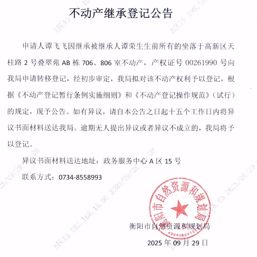 關(guān)于譚飛飛繼承譚榮生不動產(chǎn)登記的公告