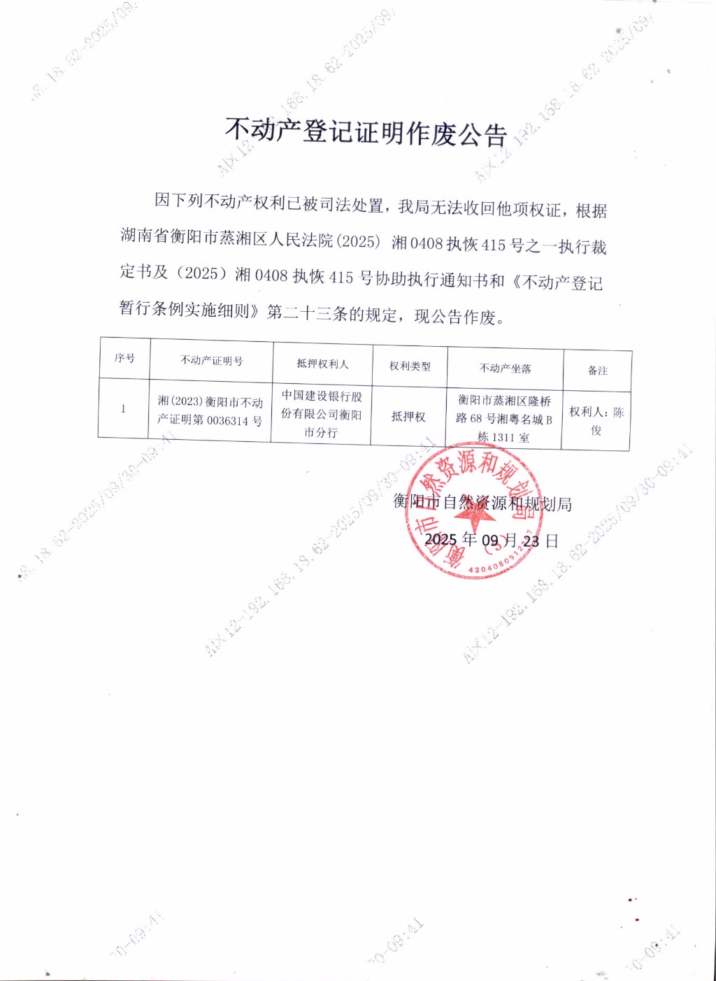 關(guān)于中國(guó)建設(shè)銀行股份有限公司衡陽(yáng)分行不動(dòng)產(chǎn)登記證明作廢公告