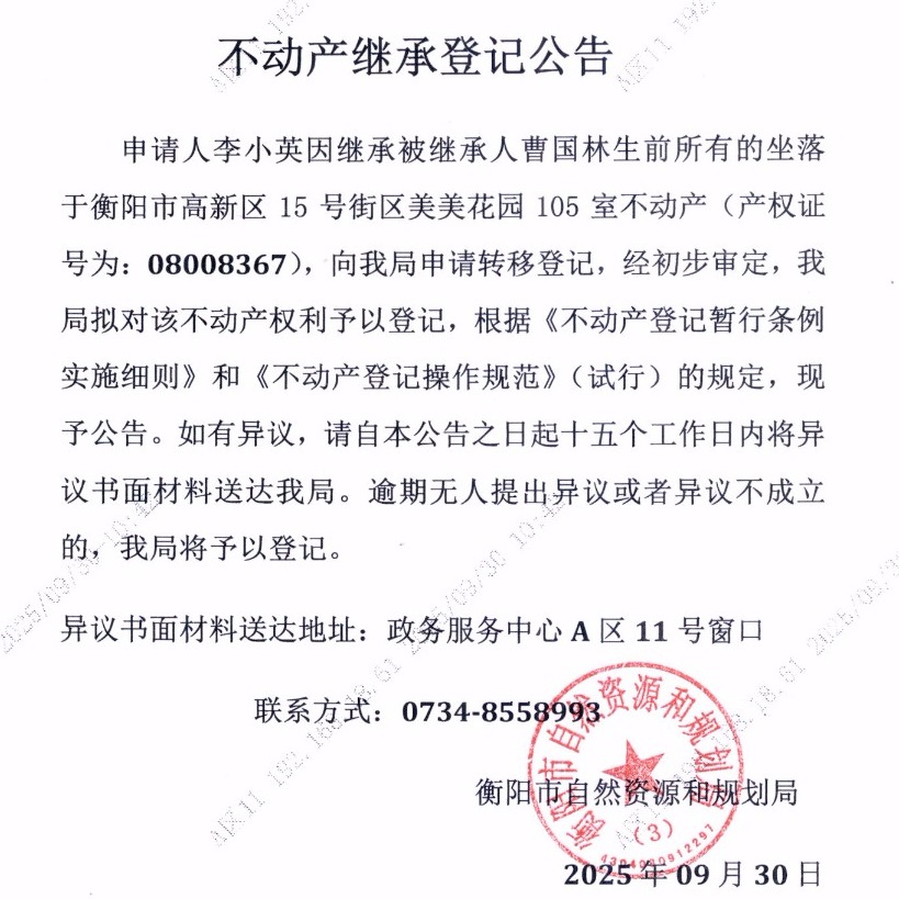 關(guān)于李小英繼承曹國林不動(dòng)產(chǎn)登記的公告