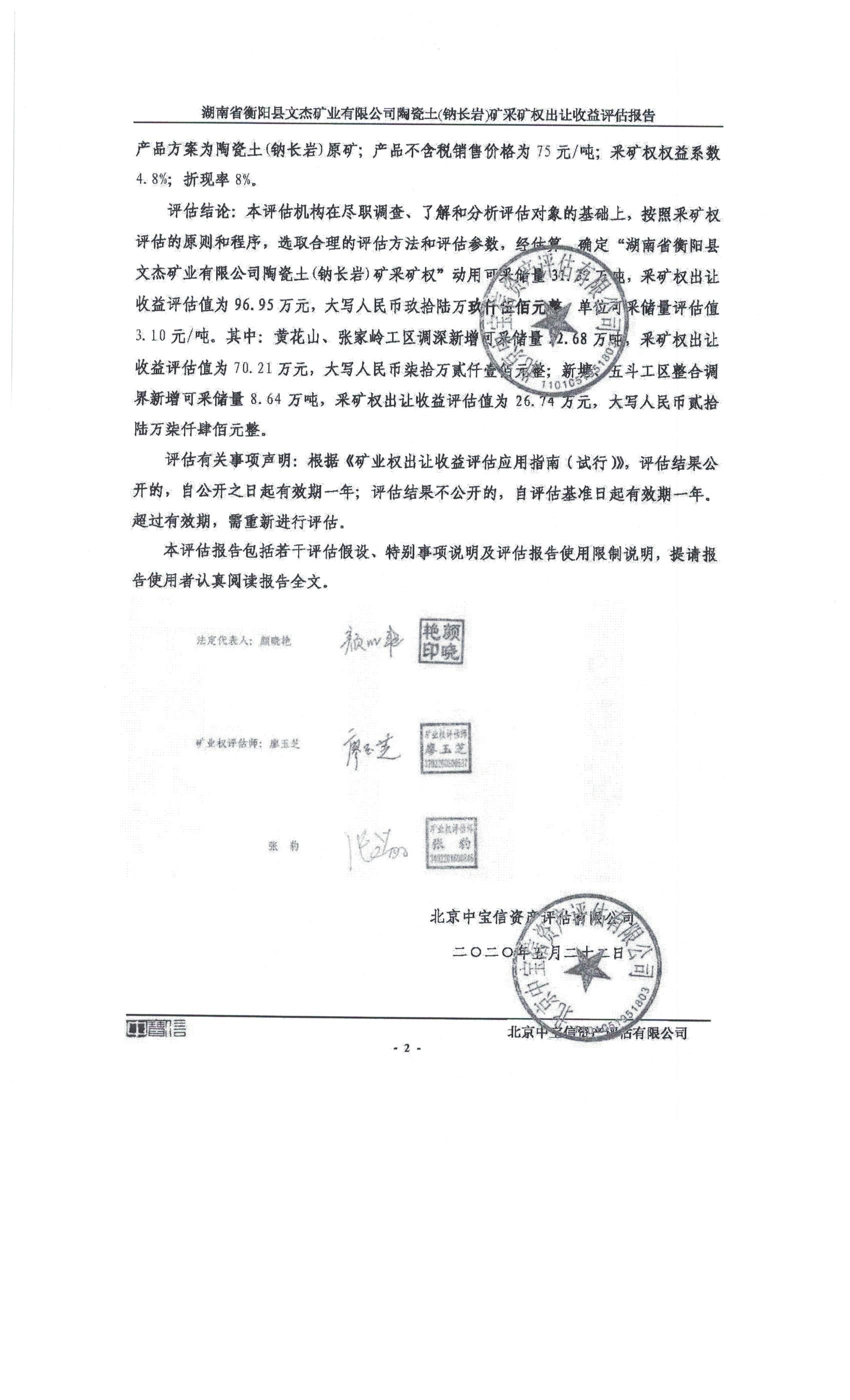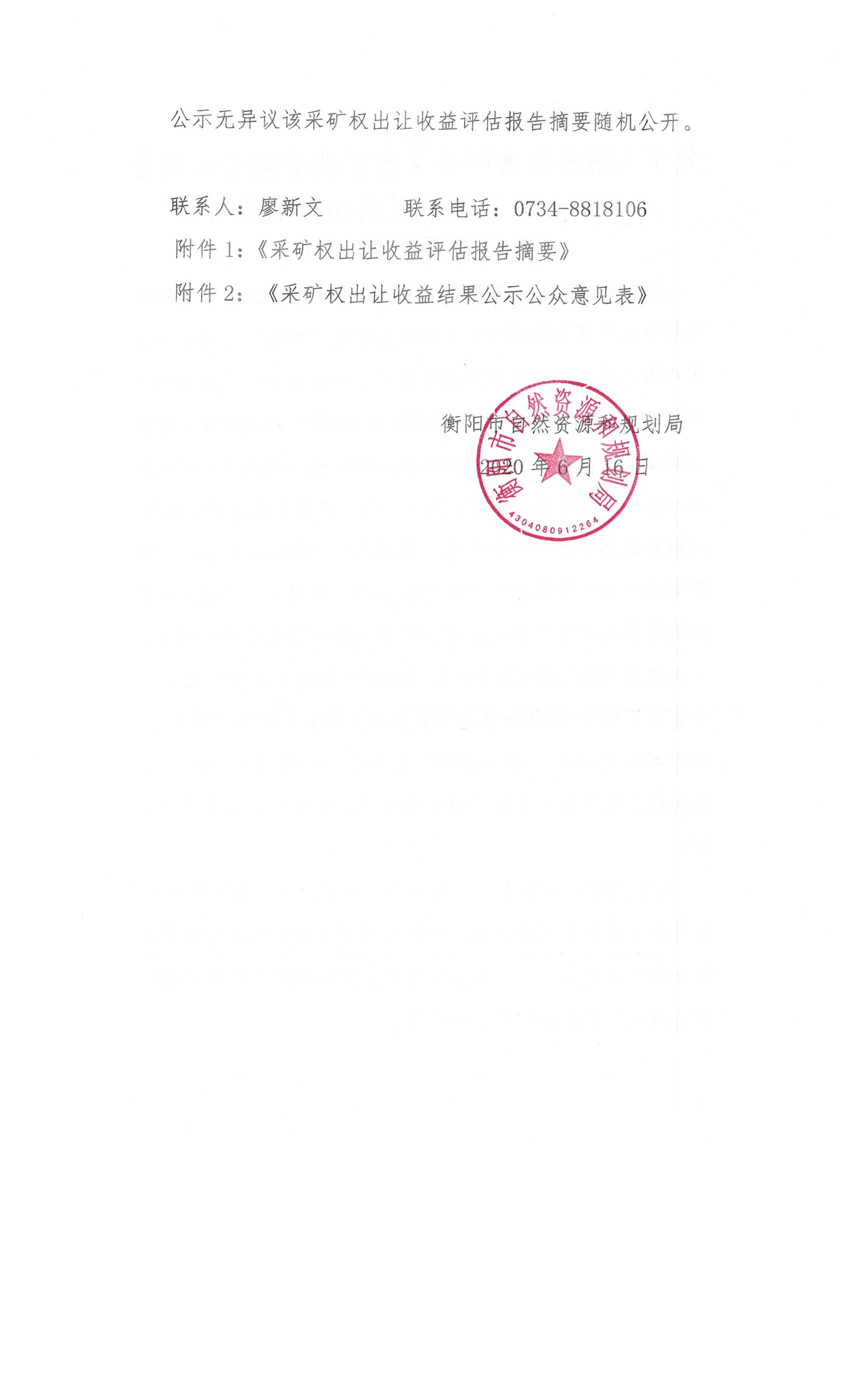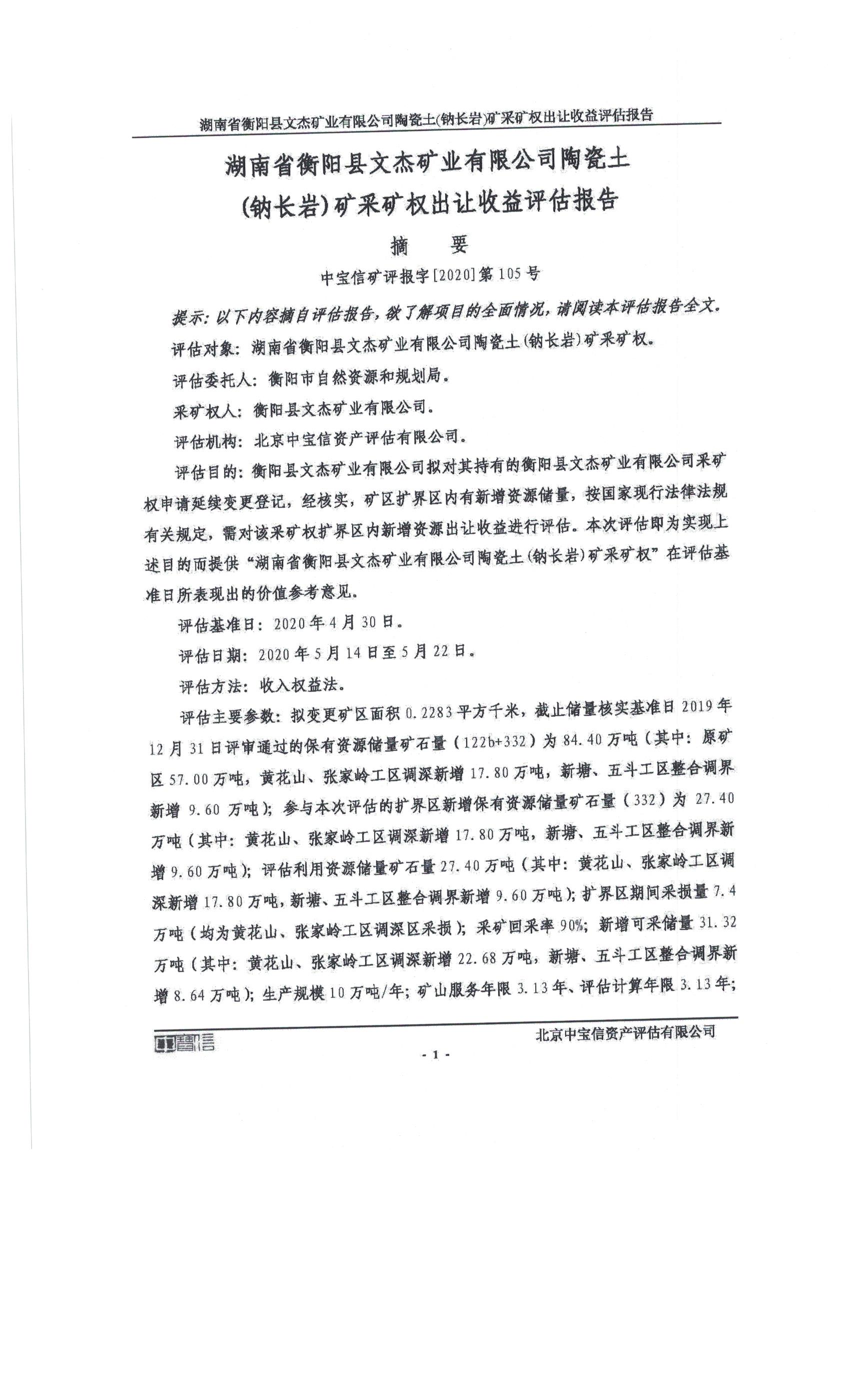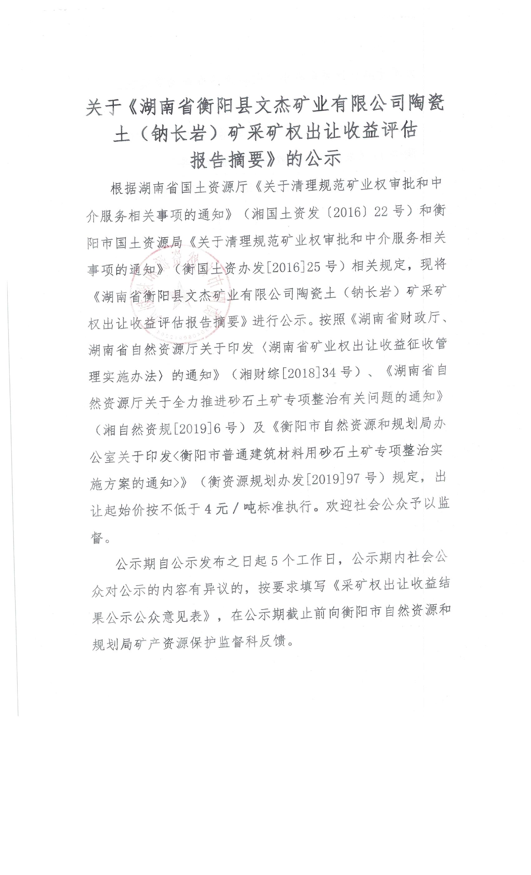 關(guān)于《湖南省衡陽縣文杰礦業(yè)有限公司陶瓷土(鈉長巖)礦采礦權(quán)出讓收益評估報(bào)告摘要》的公示