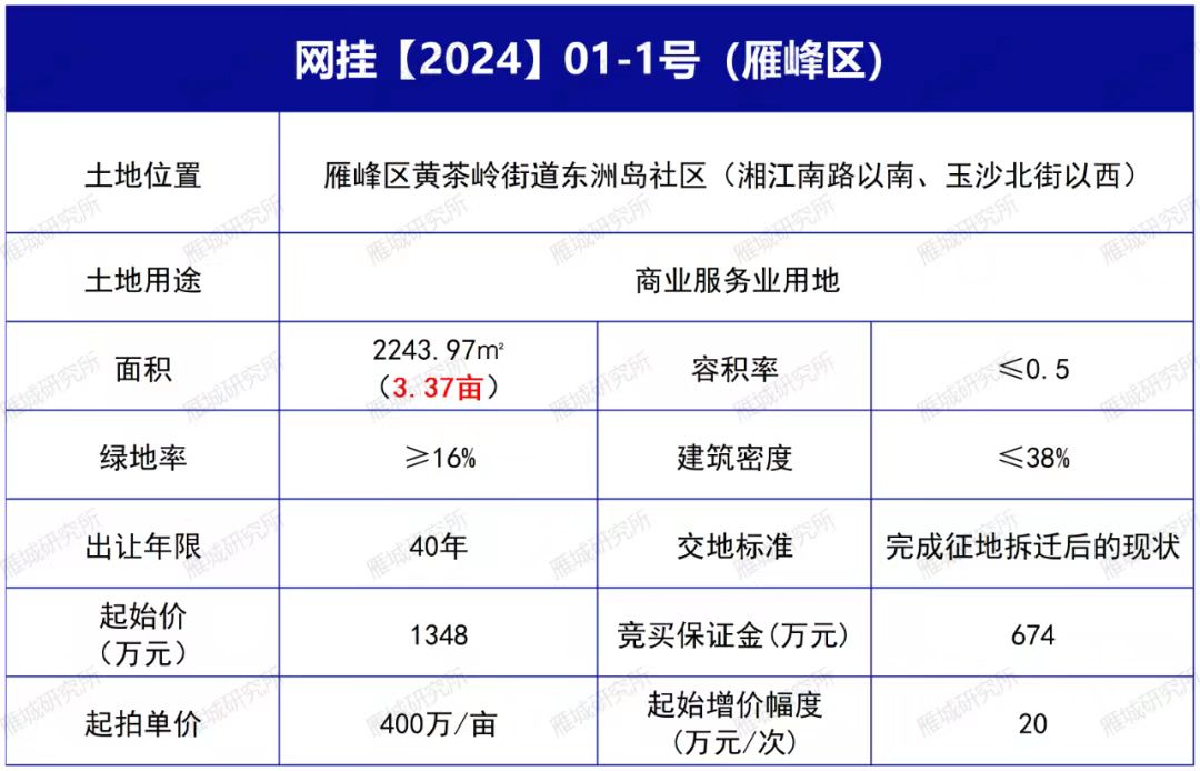 近日,衡陽(yáng)市國(guó)有建設(shè)用地使用權(quán)網(wǎng)掛【2024】01-1號(hào)地塊進(jìn)行網(wǎng)上掛牌出讓?zhuān)?/span>位于雁峰區(qū)黃茶嶺街道東洲島社區(qū)(湘江南路以南、玉沙北街以西),土地用途為商業(yè)服務(wù)業(yè)用地,宗地面積為2243.97㎡(3.37畝)。